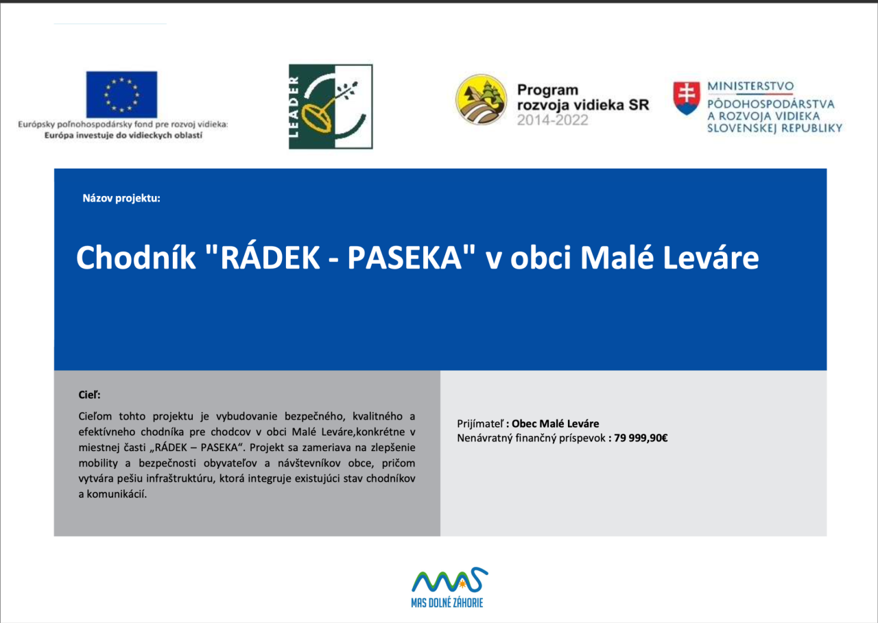 Obec s radosťou oznamuje občanom, že v lokalite Paseka bol úspešne vybudovaný nový chodník, ktorý vznikol aj vďaka finančnej podpore z dotácií z Ministerstva pôdohospodárstva a rozvoja vidieka Slovenskej republiky.