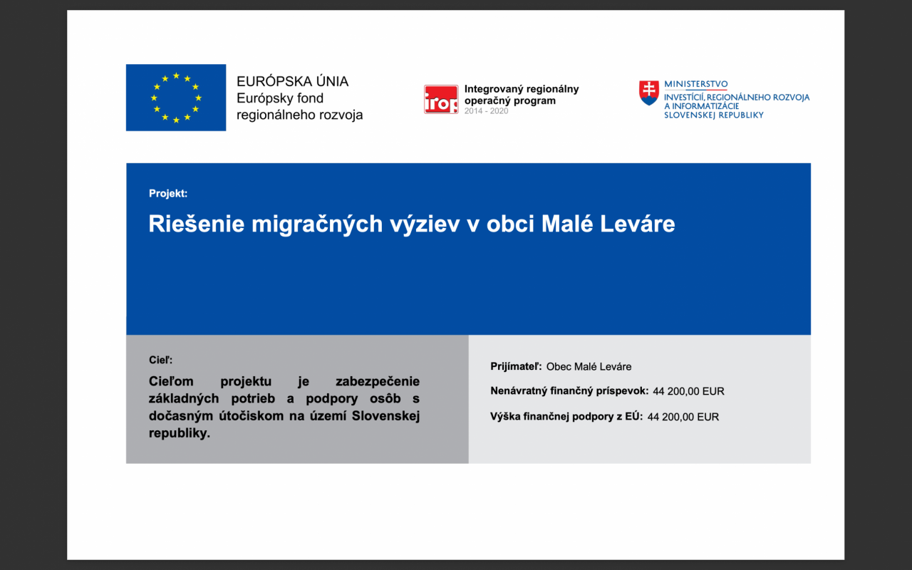 Cieľom projektu je zabezpečenie základných potrieb a podpory osôb s dočasným útočiskom na území Slovenskej republiky. Finančná dotácia je vo výške 44.200 €