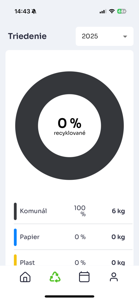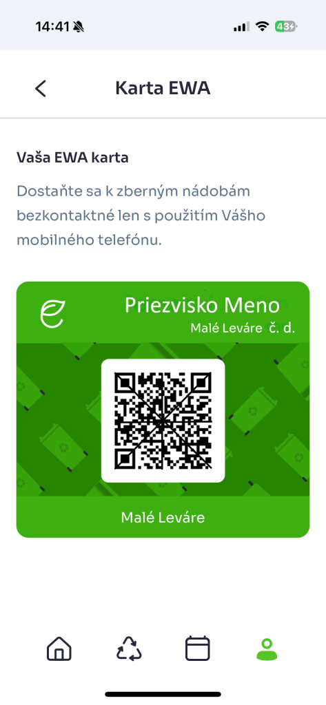 Aplikácia obsahuje aj elektronickú verziu plastovej karty, ktorou sa viete preukázať pri návšteve zberného dvora. Fyzickú plastovú kartu si budete môcť osobne vyzdvihnúť v priebehu februára 2026 na obecnom úrade. Do obdobia, kým nebudete mať k dispozícii novú plastovú kartu (či už elektronicky v mobilnej aplikácii alebo fyzicky po vyzdvihnutí na obecnom úrade), vám platí karta z roku 2025. Na priložených obrázkoch vidíte v aplikácii vzor elektronickej karty na zberný dvor a prehľad o množstve váženého odpadu za domácnosť.