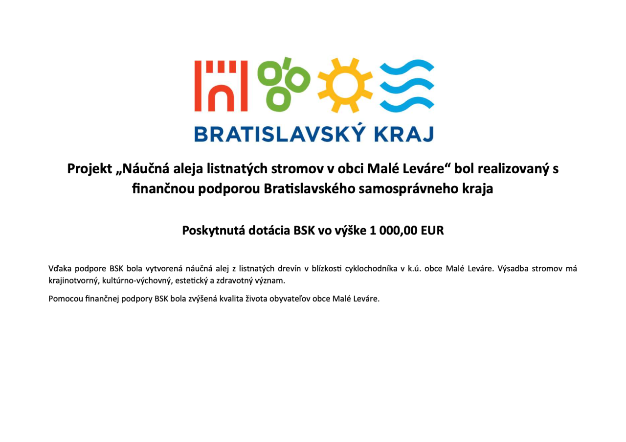 Vďaka podpore BSK bola vytvorená náučná alej z listnatých drevín v blízkosti cyklochodníka v k.ú. obce Malé Leváre. Výsadba stromov má krajinotvorný, kultúrno-výchovný, estetický význam.